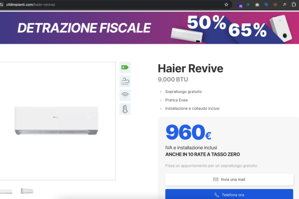 Il layout è strutturato per evidenziare le offerte e le promozioni, come la detrazione fiscale, posizionate in alto per catturare immediatamente l’attenzione dell’utente. Le sezioni principali sono ben definite, con immagini grandi e descrizioni dettagliate dei prodotti. I prezzi sono messi in risalto con caratteri grandi e ben visibili, facilitando la comprensione immediata delle offerte.La tipografia è chiara e leggibile, con un uso efficace del grassetto per i titoli e le informazioni chiave. Le call-to-action sono ben posizionate e facilmente accessibili, incoraggiando l’utente a prendere contatto o richiedere un sopralluogo gratuito.