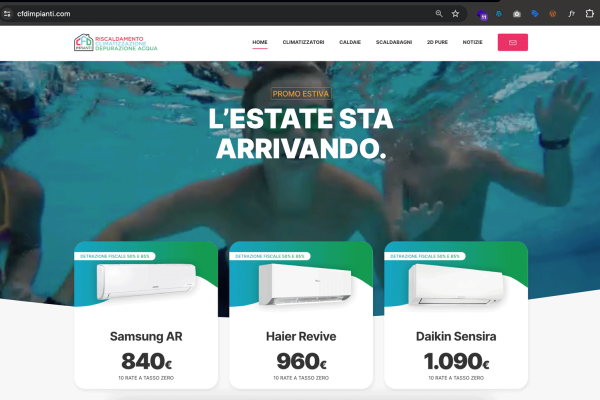 Il sito web di CFD Impianti è progettato con uno stile moderno e funzionale, pensato per fornire informazioni chiare e concise sui prodotti e servizi offerti. Il design utilizza una palette di colori audace, con predominanza di blu e viola, trasmettendo un senso di professionalità e affidabilità.