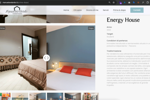 La galleria “Prima & Dopo” presenta lavori di alta qualità, corredati da immagini e descrizioni dettagliate. Complessivamente, il sito riflette l’arte e la professionalità di Manuela Velardo attraverso un design elegante e coinvolgente.