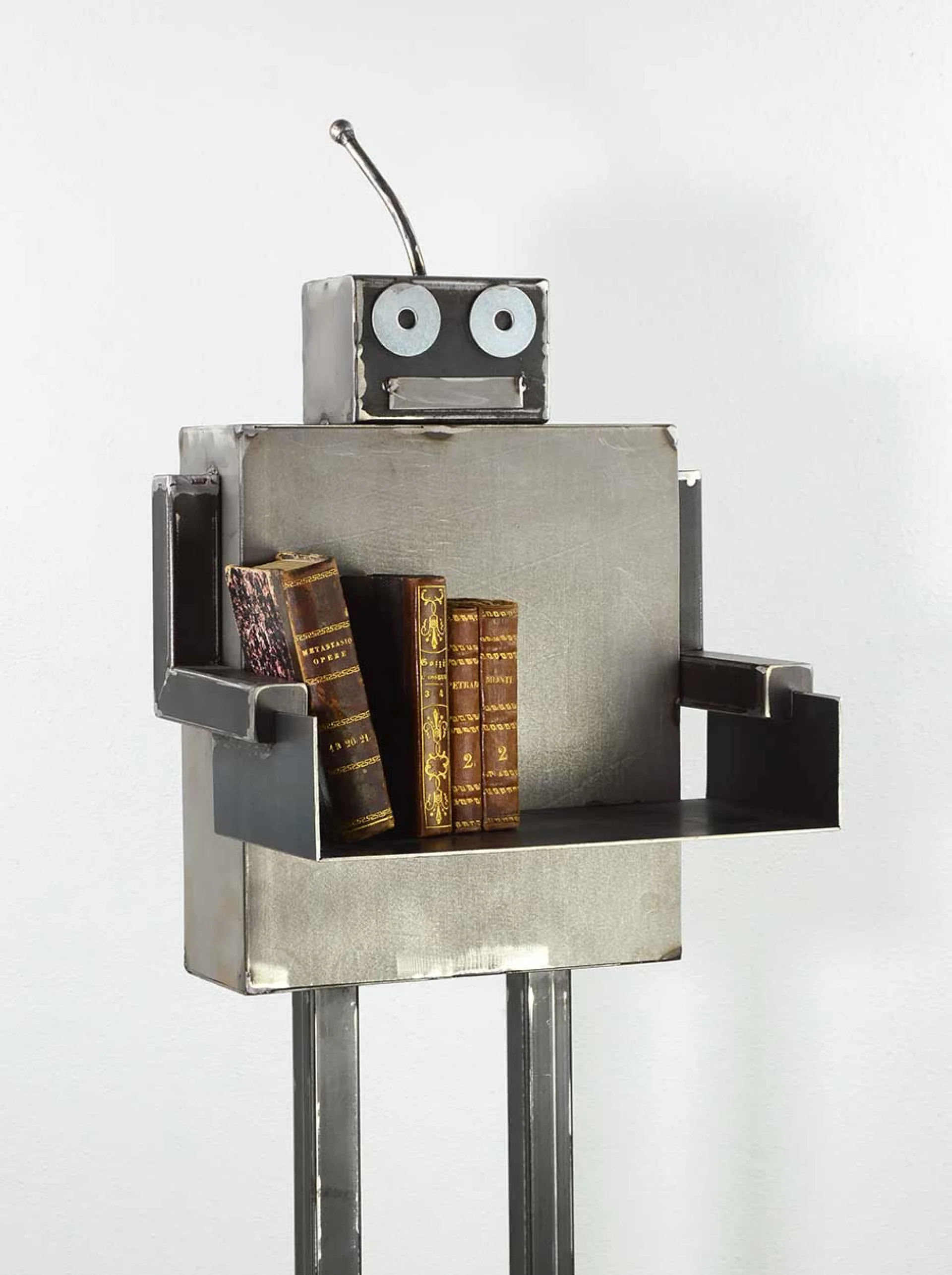 Sono un fabbro, oltre a definirmi artista, anche se questa parola mi sta un po’ stretta. Adoro creare nella mia officina, nel silenzio: inizio a forgiare robot, librerie, animali, mensole, con pezzi di metallo.