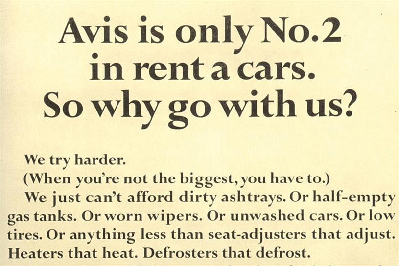 La prima è avviare una campagna pubblicitaria basata su l’ammissione di essere inferiori al principale competitor (Hertz, oggettivamente il leader del mercato dell’auto noleggio in quel momento)
